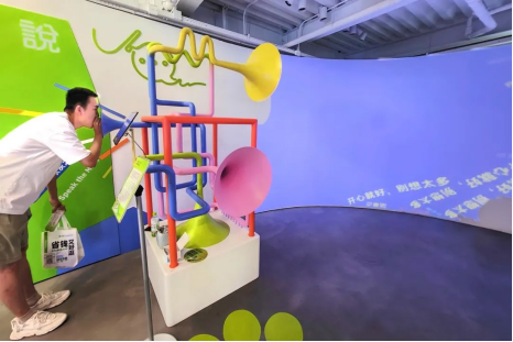 對(duì)著喇叭輕輕吹氣,你的“心聲”通過(guò)裝置管道傳遞,被釋放到屏幕畫(huà)面中,呈現(xiàn)出了“開(kāi)心就好,別想太多”的可視字樣……“未知的我”體驗(yàn)區(qū)結(jié)合AIGC與人臉識(shí)別技術(shù),根據(jù)參與者的個(gè)人特質(zhì)創(chuàng)造一系列未知而美妙的形象。