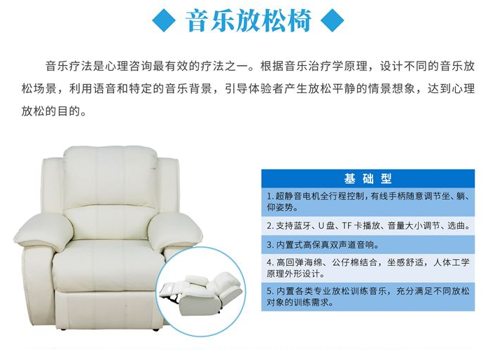 音樂放松椅:1.音樂椅材質(zhì):采用PU面料,奶白色,音樂放松椅的內(nèi)部結構為高回彈乳膠海綿、云絲棉墊層、橡筋彈簧帶、錳鋼蛇型簧等多層構成,結實耐用,坐臥舒適。 規(guī)格:高110*寬105*厚105cm;2.音箱:內(nèi)置功率音箱,可透過沙發(fā)體播放給使用者,對周圍干擾極??;3.不銹鋼珍珠白萬向調(diào)節(jié)升降支架:可360度自由調(diào)節(jié)。