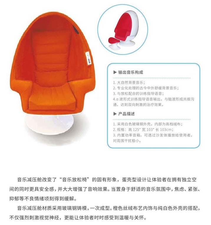 減壓太空艙改變“音樂(lè)放松椅”的固有形象,蛋殼型設(shè)計(jì)讓體驗(yàn)者在擁有獨(dú)立空間的同時(shí)更具安全感,并且也大大增強(qiáng)了音響效果。當(dāng)置身于舒適的音樂(lè)氛圍中,焦慮、緊張、抑郁等不良情緒頃刻得到緩解。材質(zhì)主要采用玻璃鋼鑄膜,一次成型,橙色絲絨布藝內(nèi)飾與純白色外殼的搭配,不僅強(qiáng)烈刺激視覺(jué)神經(jīng),更能讓體驗(yàn)者時(shí)時(shí)感到溫暖與關(guān)懷。