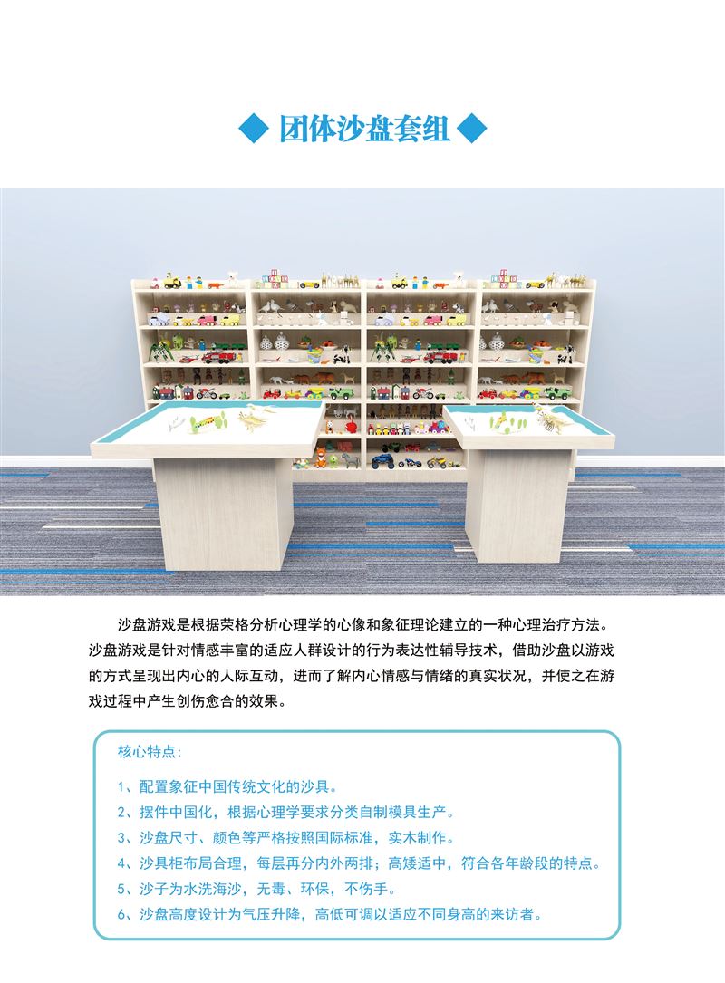 含團(tuán)體沙盤1個(gè)和個(gè)體沙盤1個(gè),沙具架4個(gè)、1200個(gè)沙具、精選天然消毒海沙、沙耙工具。