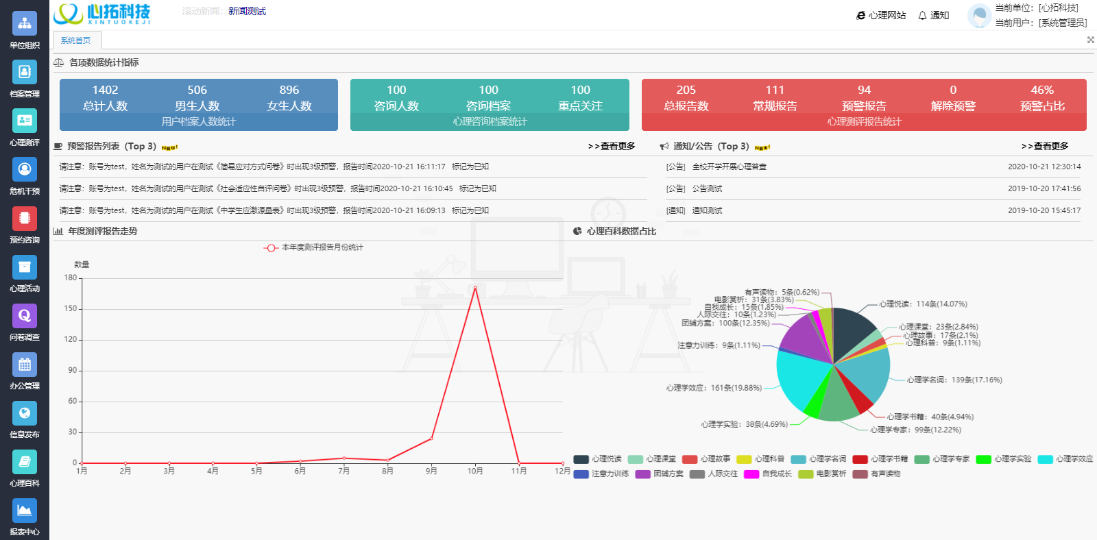 心理健康教育管理服務云平臺包括系統(tǒng)管理、單位組織、用戶檔案、心理測評、心理咨詢、危機干預、心理百科、心理活動、投票問卷、辦公管理、信息發(fā)布、報表中心等十二大模塊,該平臺基于現(xiàn)今社會大眾心理的工作特點和流程,使得工作人員能夠切實了解心理工作的真正需求,并給予切實的幫助,進而推動工作開展更加便捷、高效。