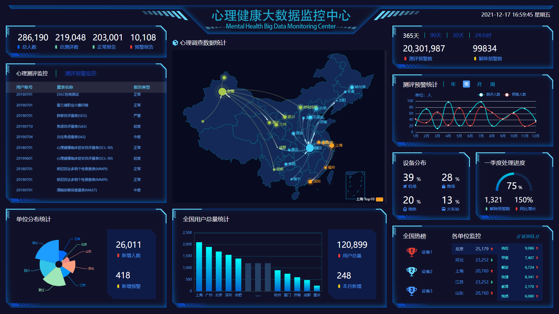 14、心理大數(shù)據(jù)監(jiān)控中心:系統(tǒng)提供專業(yè)的心理大數(shù)據(jù)監(jiān)控中心,監(jiān)控中心頁面展示的數(shù)據(jù)既全面又多樣化,使得上層領導以及管理者對當前系統(tǒng)內所有用戶的心理健康狀況有個明確的了解。